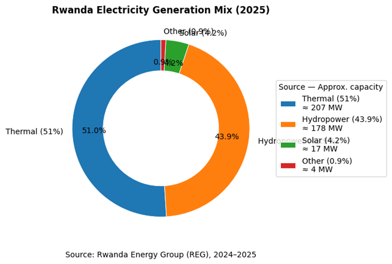 Over the last 30 years, Rwanda has increased electricity access, from 1% in the 1990’s to 83% in 2025. Installation capacity has expanded from 228MW in 2019/20 to 406 MW in 2023/24, including domestic generation (321.3 MW) and imports from shared regional plants (85.1MW).