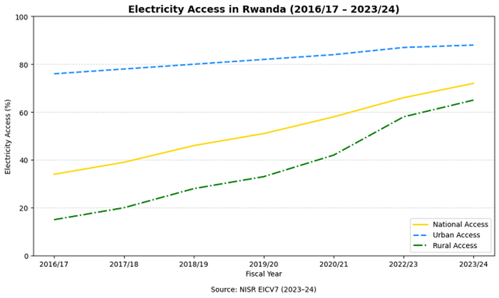 Rwanda’s electricity access has surged from 1%in 1990’s to 84.6.% in 2025, according to the Integrated Household Living Conditions Survey (EICV 7, 2023–2024) by the National Institute of Statistics Rwanda (NISR).