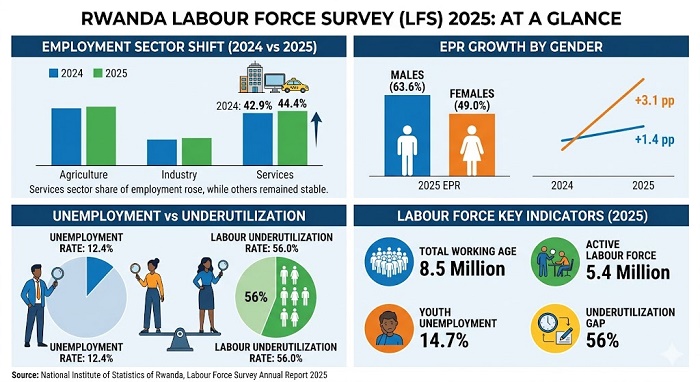Overall, Rwanda’s labour force has reached 5.4 million persons, with the EPR rising to 55.95 from 53.6 in 2024, according to the Stat agency.